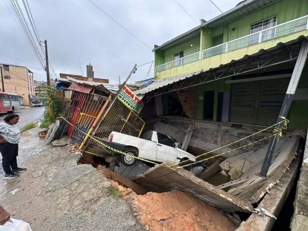Uma garagem construída sobre um córrego cedeu após as fortes chuvas que atingiram a região de Ribeirão das Neves, na Região Metropolitana de Belo Horizonte, provocando a queda de um carro em uma cratera, na rua União, número 185, no bairro Jardim Alvorada, na região de Justinópolis. O Corpo de Bombeiro e a Defesa Civil foram acionados.