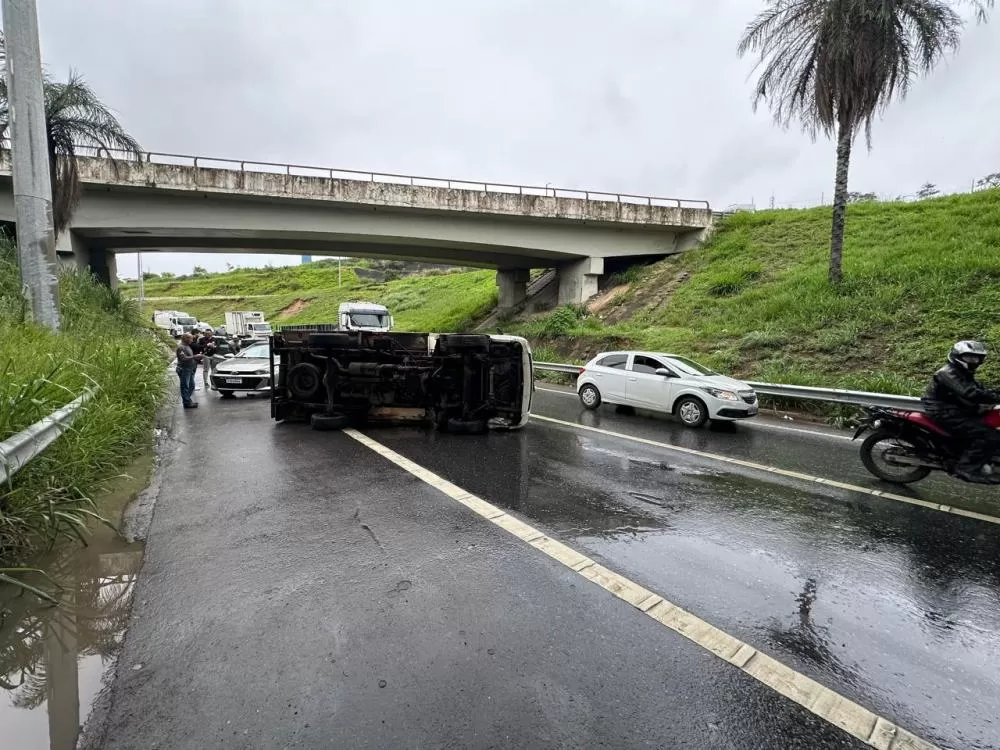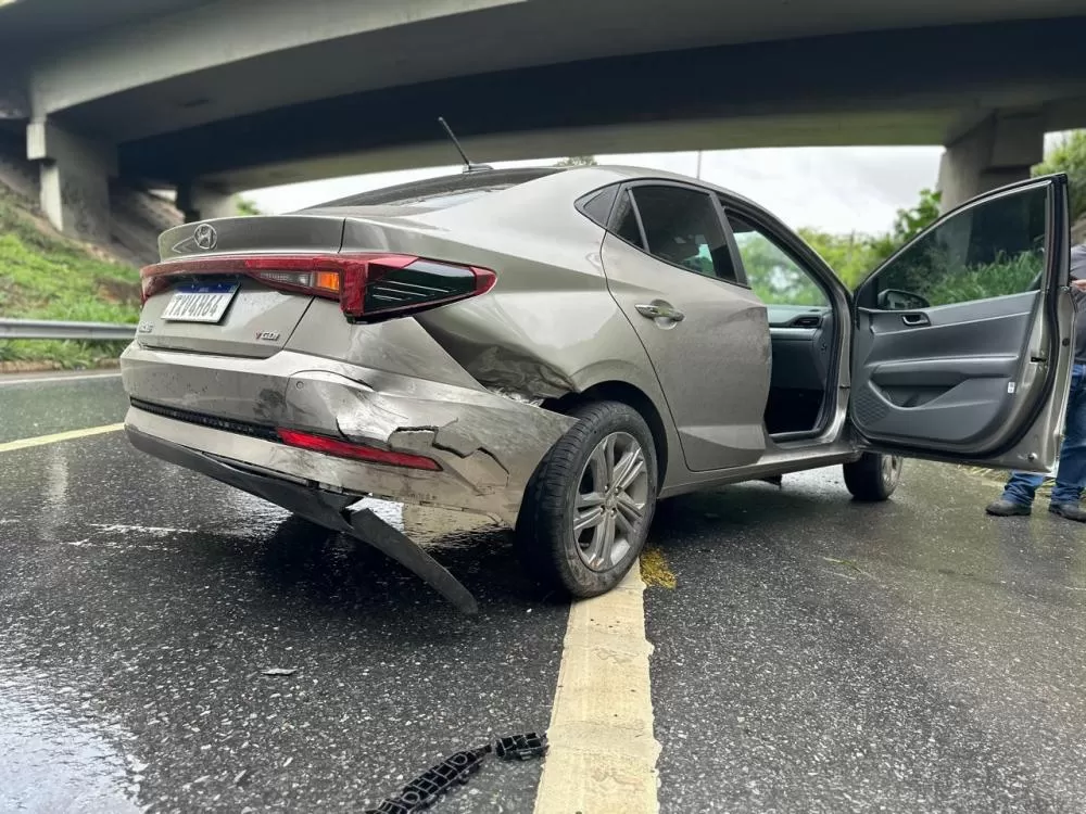 Após o caminhão capotar, o motorista do HB20, prata, Leandro Reis, de 46 anos, que vinha atrás, não conseguiu frear o seu carro, e acabou se chocando com o caminhão, batendo o lado traseiro esquerdo do seu veículo.