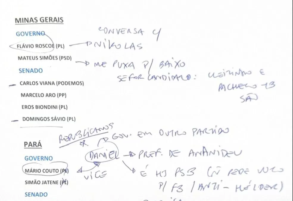 Os registros citam Minas Gerais como um dos principais pontos de atenção. O vice-governador Mateus Simões (PSD) aparece nas anotações como um nome que, segundo o texto, “puxa para baixo” o projeto presidencial do grupo no estado.