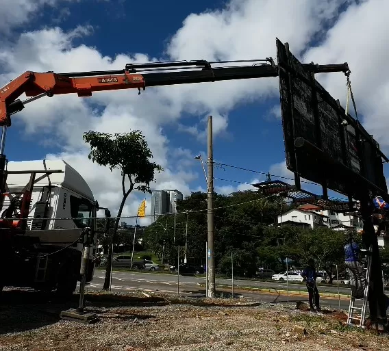 Nesta terça-feira (17), equipes municipais realizaram a retirada de dois painéis publicitários na Rua Musas, no bairro Santa Lúcia, nas proximidades da Avenida Raja Gabaglia. Os equipamentos estavam em área de grande visibilidade e intenso fluxo de veículos.