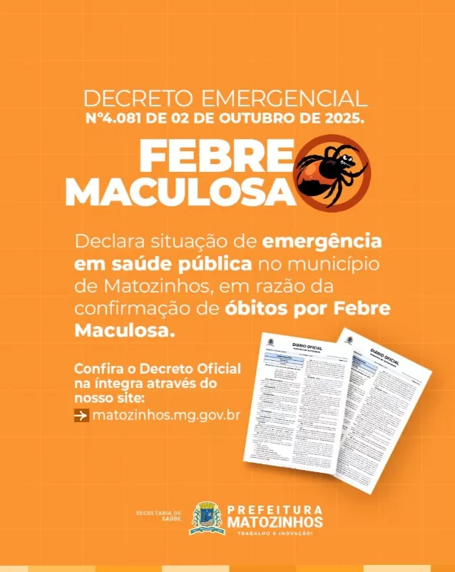A Prefeitura de Matozinhos, na Grande Belo Horizonte, decretou situação de emergência em saúde pública após a confirmação do segundo óbito por febre maculosa no município. A decisão foi publicada nesta quinta-feira (2) no Decreto nº 4.081/2025 e terá validade de 180 dias, podendo ser prorrogada conforme o andamento das investigações epidemiológicas.